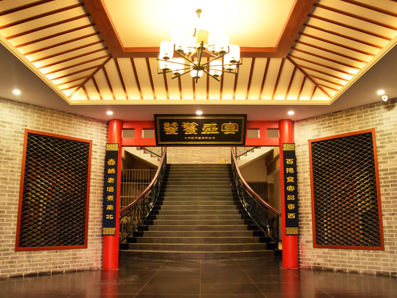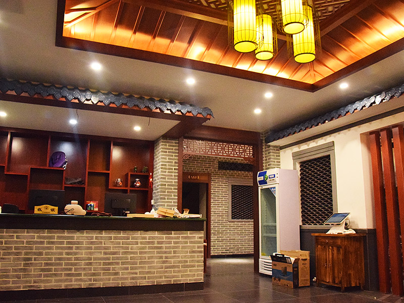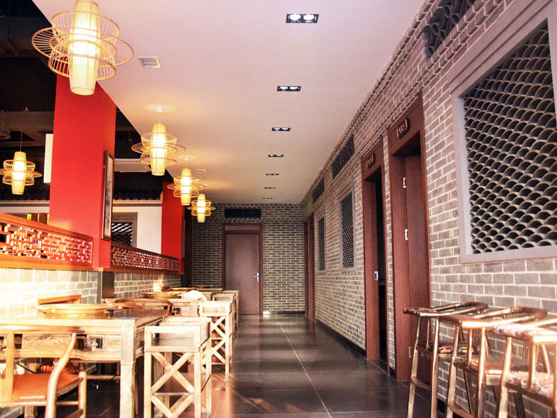 進門前廳使用仿青磚墻面配以紅漆仿古式門窗框架,木質(zhì)柵格窗與亭頂式圖案吊頂,塑造仿清朝磚亭效果,對稱布局莊重又大氣。