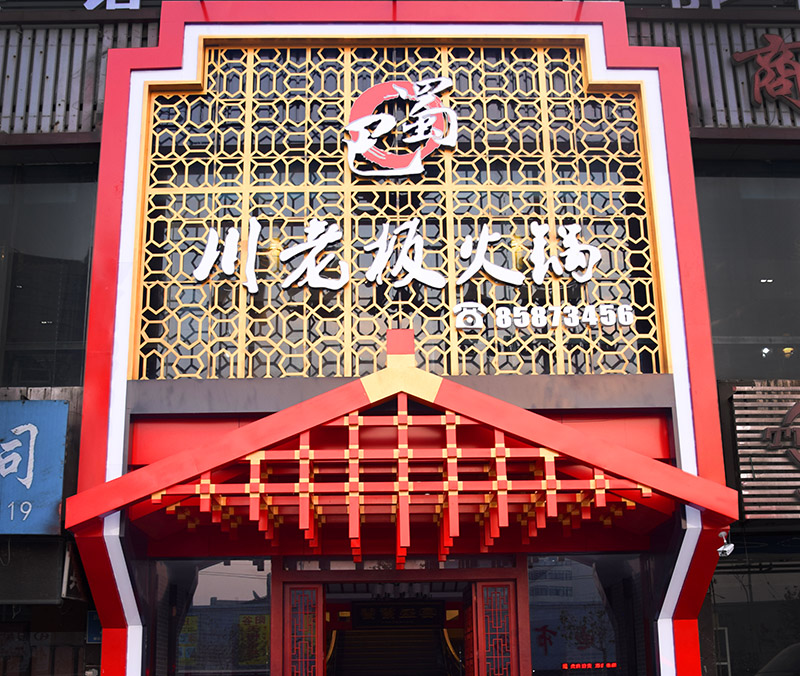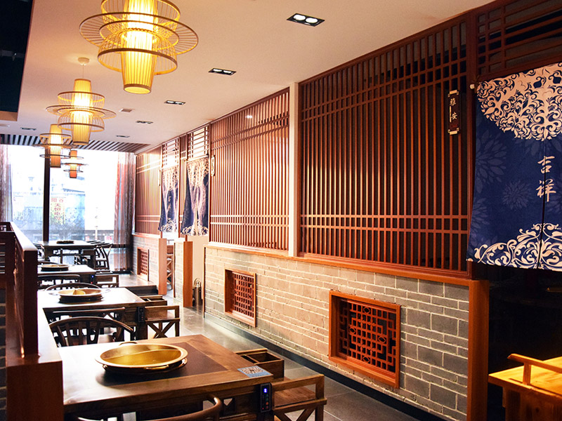 包間紅木色柵格墻和鏤空雕花既保證了空氣的流通和透光性又保證了就餐私密性,紅色背景墻和椅墊交相呼應(yīng),表現(xiàn)了川系火鍋店麻辣火熱的特質(zhì)。