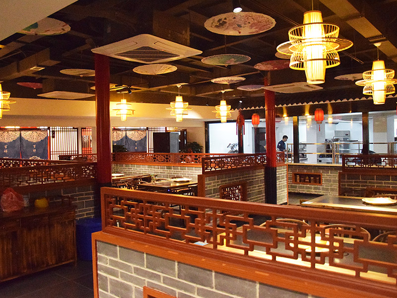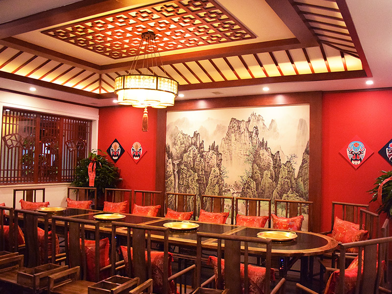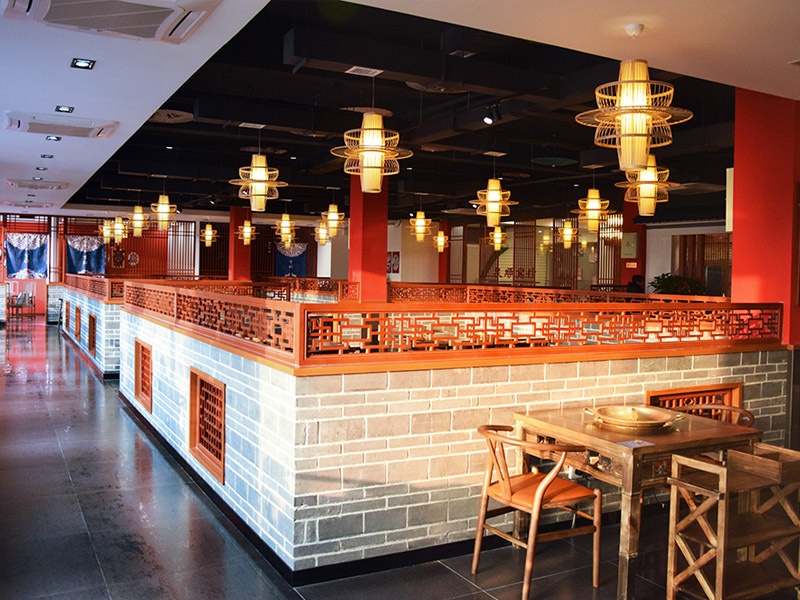 大廳紅色漆柱與仿古式幾案和官帽椅相呼應(yīng)搭配工筆水墨畫和燈籠式樣吊燈,雕花木質(zhì)柵欄既輔助塑造整體環(huán)境又保證了就餐的私密性。