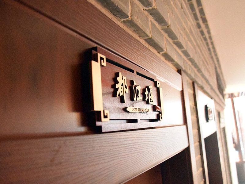 二樓招牌創(chuàng)意性使用了時下大熱的活字印刷板式作為招牌底板圖案,深灰色底色給人一種沉穩(wěn)和文化感,通過顏色的反差使客人注意力集中在招牌本身上,同時底板刻印的本店特色也能加深顧客印象。