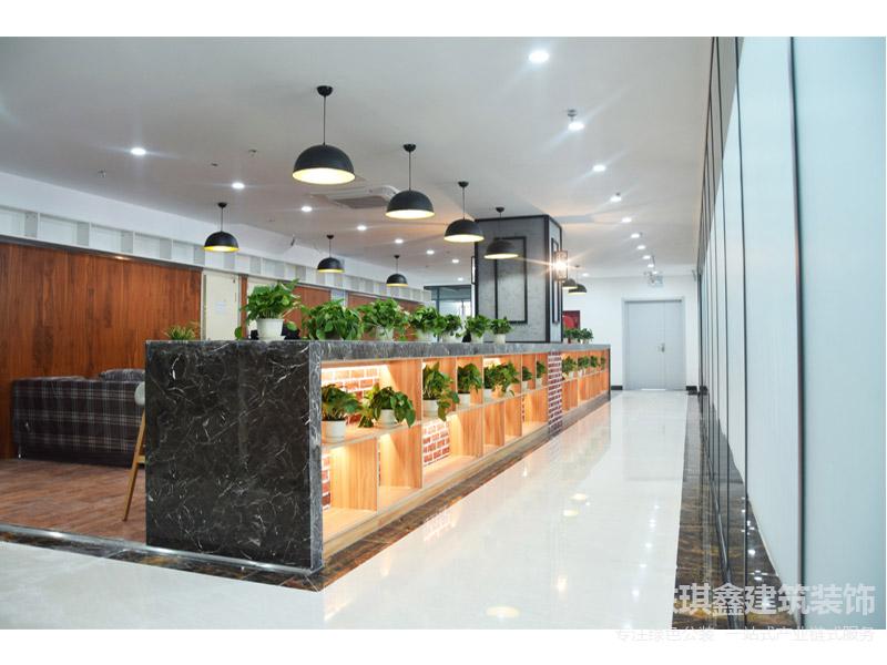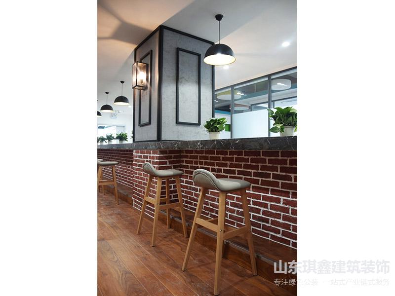 休閑接待區(qū)采用墻磚裸露的吧臺設(shè)計配以仿古顯紋復(fù)合強化淺色木地板,營造復(fù)古輕松的氛圍。滿足員工早餐和下午茶的人性化需求,吧臺對面采用落地的玉砂玻璃隔墻,既隔斷了空間又滿足了采光需要。