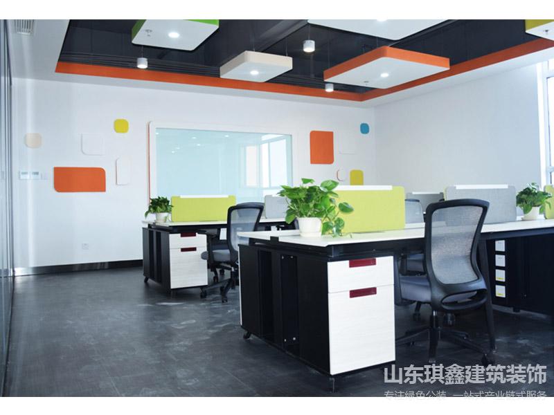 開放辦公區(qū)域使用灰黑紅幾種色彩涂裝吊頂,虛實相應(yīng),使得整個空間顯得簡練而具有動感;而地板采用地磚石材質(zhì)感的冷灰色又增添一分干練。桌面的綠植既改善空氣質(zhì)量又使各工位之間既有分割又有聯(lián)系。