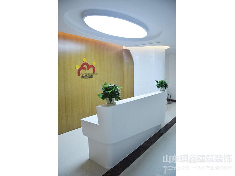 前臺區(qū)域結(jié)合泰岳教育的企業(yè)文化和公司職能設(shè)計成為書卷翻頁的效果,并在仿書卷的柱子上刻印了其企業(yè)文化,同時使用彰顯古樸穩(wěn)重的木色,展現(xiàn)其身為文化公司的底蘊。