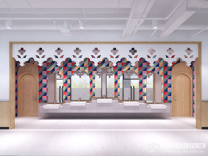 燈具創(chuàng)意的做成云朵造型,既能使吸引兒童的興趣又柔化了照明光線;洗手間貼心的設(shè)計了各種高度的洗手臺,滿足從不同年齡段兒童到成人的使用需要,結(jié)合鏡面做了大面積糖果色彩的拼接,吸引兒童勤加洗手,有助于培養(yǎng)好的衛(wèi)生習(xí)慣。
