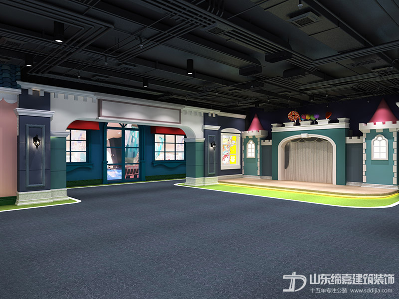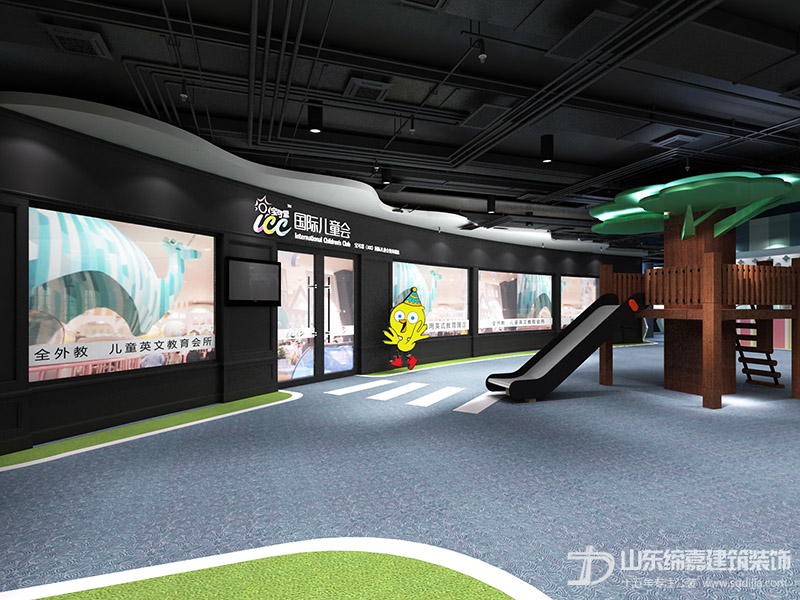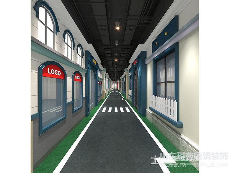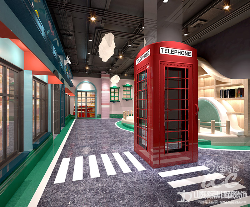 主體設(shè)計采用了模擬城區(qū)的形式,營造成微縮的城市,有城市的道路系統(tǒng),馬路,斑馬線,路燈,停車場。中間用紅色復(fù)古電話亭進行分割。教室走廊墻壁全部使用玻璃隔斷,中間使用玉磨砂條裝飾,既保證了采光又便于家長隨時照看孩子的狀態(tài),同時磨砂條也避免了孩子因玻璃高透而發(fā)生的碰撞狀況。
