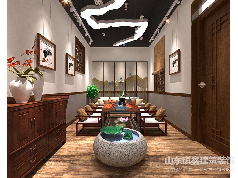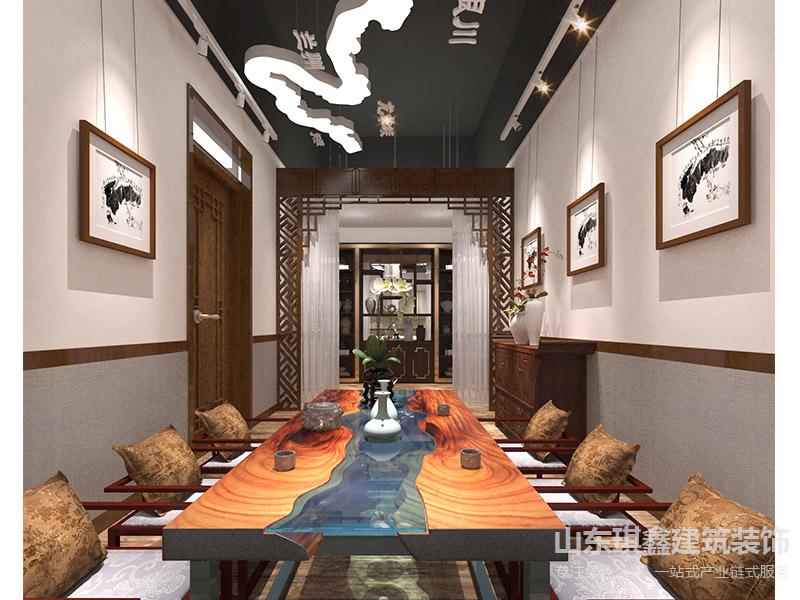 水區(qū)域采用定制創(chuàng)意桌臺,茶桌中間鏤空,利用與大地相近的實(shí)木色與天然木紋做出河道兩邊山丘的樣子,中間填充藍(lán)色琉璃做出河水的效果,同時又與天花板做的黃河河道相呼應(yīng)。桌子一端放置圓形石質(zhì)碗蓮花壇,與茶桌中間和吊頂天花板的“河道”遙相呼應(yīng),仿佛有流水瀑布一般的意境。